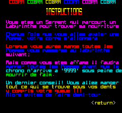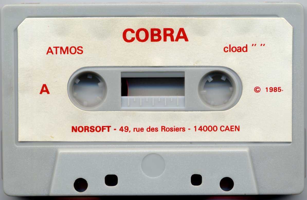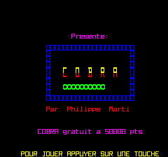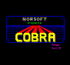 When the tape is loading, you can admire the ads of Norsoft (Tyrann, Rabbit, Montsegur, and, of course COBRA). Unfortunately this magnificent home screen appearing in crossfade of the most beautiful effect, will really not long remain on the screen ! |