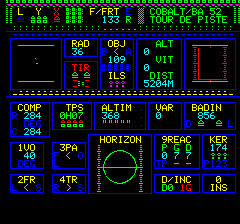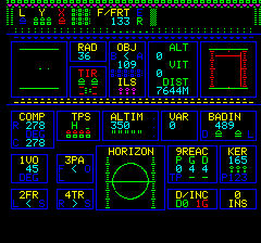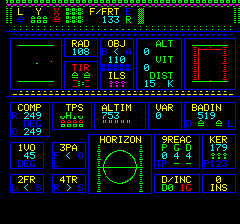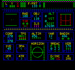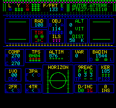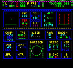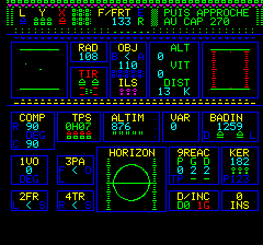 "Bien, alors tu te demandes comment poser ton Cobalt ? régle d'or: Courage, car c'est dur ! de nombreux échecs t'attendent, mais si tu suis bien mes conseils, tu en baveras moins que moi ! Seul les meilleurs des meilleurs rejoindront le club réservé des rares pilotes de Cobalt !" A proximité d'une Base : - active les instruments d'atterrissage ILS > I (il clignote) - appele la tour > E et suis ses instructions: - entre la fréquence de la balise radio du bout de piste, ici 110 - donc tape O puis B puis 110 > résumé: I E O B 110 le radar d'atterrissage s'allume à gauche & la mire d'alignement à droite - Ralentis au maximum (genre 500 Kms - moteurs sur 3 & 3 (par ex) - sors le train (qui ralentit franchement l'avion) - baisses bien les volets (ralentissent aussi) Pour se poser à Paris (BA52), il faut s'orienter plein EST au CAP 270° En cas de mauvais sens ou de piste dépassée, la tour de controle ordonne un tour de piste afin de se réaligner correctement (accélerer Euphoric, car c'est un peu longuet) Pour s'aligner dans l'axe de la piste, l'ILS affiche une mire rouge dans l'écran de droite , qui indique intuitivement ta position: il faut la centrer, la ligne verticale d'abord (c'est l'axe de la piste) puis l'horizontale (c'est la pente idéale) par rapport à elle, tu comprends immédiatement si tu es trop haut ou trop bas , trop à droite ou trop à gauche, c'est intuitif. Le radar n'affiche les mires qu'à partir de 19 kms ! NB: il faut s'aligner assez loin genre 30 Kms et être déjà à faible vitesse pour avoir le temps de s'aligner, quand on est proche de l'axe il faut toujours corriger avec la fonction D , dés que la ligne verticale est en plein milieu affiche immediatement le cap sur 270° et ne plus devier du tout ! (astuce capitale: se placer un poil en dessous de la mire, ce qui reviendra à se poser en tout début de la piste, on a alors plus de distance pour freiner, et ça sera pas du luxe !! la piste faisant plus de 2500m ) La vitesse doit ètre minimale , limite du décrochage (400 Km/h) au moment du poser des roues pour cela les volets , qui sont des ailerons le long des ailes doivent être bien inclinés (50°) ce qui permet de voler à trés basse vitesse sans décrocher. La vitesse de descente (VAR) doit être réguliere et minimale (-10 -12 pas plus), douceur SVP !