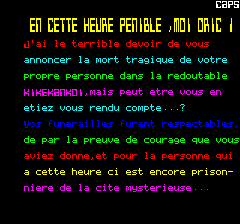 Afin de préserver l'interêt du scénario, la 2e partie se trouve sur la page suivante, vous ne devriez la regarder qu'aprés avoir vaincu le robot, au risque de gacher le suspense...