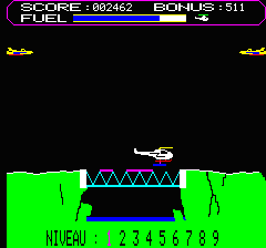 ![]() Screen 1 The screen of the bridge to rebuid. You have to land the helicopter on an empty space to put the tile in place. |