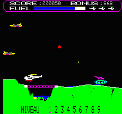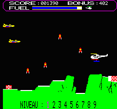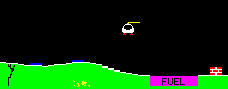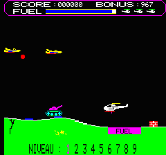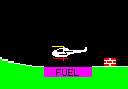 The helicopter is burning fuel, so you will have to land on the pink zone named FUEL to refuel. |