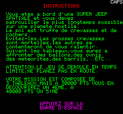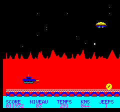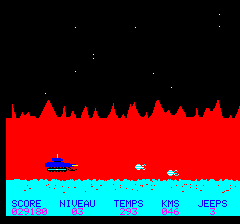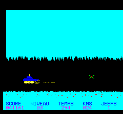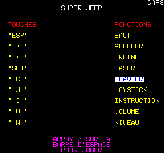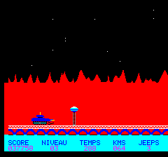 It's fine to have the joystick option, very rare At the beginning, you are surprised by the slowness of jumps useful because of the keys which are not easy to use You must drive during 1000 kms to finish a level After 3 levels, you return to the first one with increased difficulty > after 30 000 points : you acces at the 4th level > after 40 000 points: you unlock the last level 5 levels |