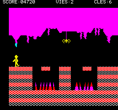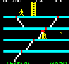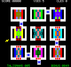 Il est une légende, en pays arabique, qui propose à l'aventurier courageux de ravir aux monstres des neuf maisons, les clefs d'or des salles obscures vers les trésors nouveaux. Ainsi chacun peut affronter zombies, fantômes et autres méduses gluantes pour gagner "la graille", mets mythique, au pouvoir d'immortalité. Aussi terrifiants par leur aspect que par leurs gestes, ces êtres immondes ont, en outre, un pouvoir terrifique sur l'oreille: ILS PARLENT ET HURLENT pour rendre fous les pauvres hères qui les bravent. Seuls les talisman magiques récoltés au défi des dangers ont un effet destructeur sur les monstres. Bonne quête... Talisman est un jeu de plateformes et d'horreur qui vous met dans la peau d'un aventurier. Le jeu se déroule dans une succession de tableaux à la Donkey Kong où se trouvent divers monstres tels que les légendaires Zombies et Araignées. Une chose à rappeler c'est l'ambiance du jeu. Talisman se fait remarquer par la tension qu'il dégage : une ambiance sonore inquiétante, car le jeu Parle !! les actions à effectuer crispantes, tout cela engendre un stress bien souvent fatal. |